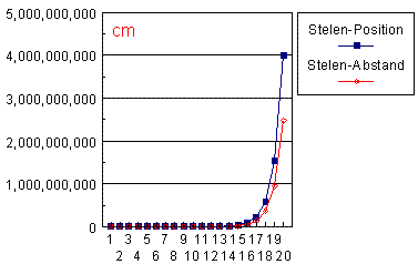 Auch aus dieser Tabelle geht deutlich hervor, daß der nächstfolgende Abstand sich immer durch Multiplikation des vorhergehenden Abstandes mit F2 ergibt (außer der Start-Strecke). Der letzte und größte Abstand ist die Ausgangsstrecke a, multipliziert mit F37.