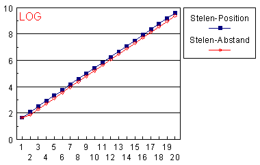 Diesen logarithmischen Zusammenhang für Stelen-Position und Stelen-Abstand illustrieren folgende Graphiken, wobei für den Stelen-Abstand mit Ausnahme der ersten Position die ungeraden Exponenten und für die Stelen-Position die geraden Exponenten für a*Fn gelten.