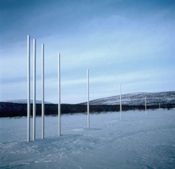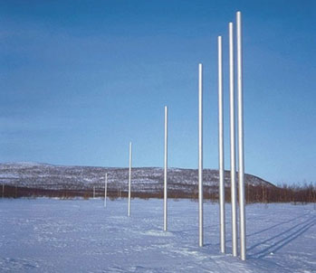 Auf dieser Seite möchte ich ein besonderes Projekt vorstellen, nämlich ein weltumspannendes: Jo Niemeyer fertigte eine Installation von insgesamt 20 jeweils 5.50 m hohen Edelstahl-Stelen, die an präzise vermessenen Orten in dynamischen Abständen den Erdball umspannen, wie ein künstlicher Großkreis mit eigener Dynamik. Beginn und Endpunkt zugleich liegen in der kargen Tundra Finnlands, wo die "Eleganz des Einfachen" und die Dynamik der nüchternen Stelen besonders gut zur Geltung kommen. Hier am Ausgangspunkt sammelt sich die Energie der Installation, die von hier aus in dynamisch zunehmenden Abständen ihre Erdumkreisung beginnt.