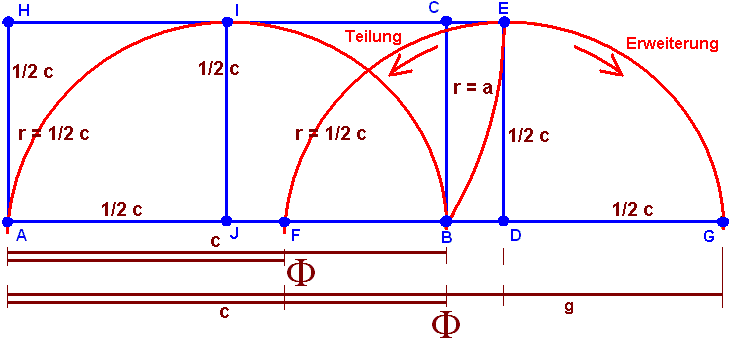 Eine sehr ästhetische Darstellung dieses Prinzipes, bei dem man im Goldenen Schnitt wahlweise nach innen teilen oder nach außen erweitern kann, stammt gleichfalls von Jo Niemeyer. Bei dieser Darstellung wird die Gleichheit der Kreisbögen in Grundeinheit und Erweiterungseinheit bzw. Teilungseinheit hervorgehoben. Schlüsselstelle der Konstruktion ist wie oben der seitliche Versatz CE bzw. BD durch Übertragung des Diagonalmaßes HB = HE.