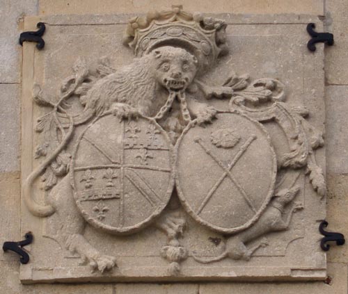 Das Schloß selbst besitzt keine Wappen an den äußeren Fassaden. Linkerhand (entspr. der oberen Ansicht) des Schlosses führt ein großer Hochzeitsbogen (außerhalb des Bildes) in den Park (im Vordergrund), im Bogenscheitel ein Ehewappen de Geisen / d'Harnoncourt.