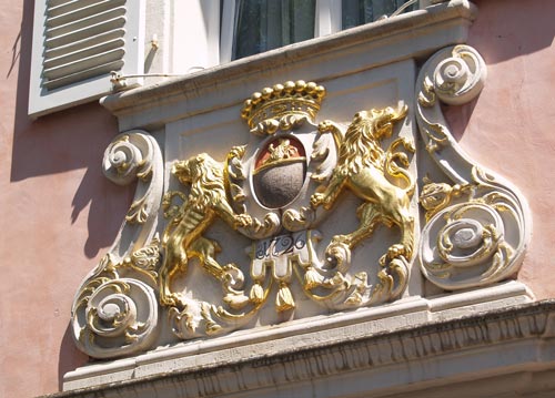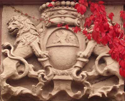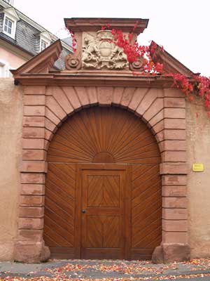 Ein dritter Wappenstein ist ganz links an der Mauer am Anfang der Straße "Große Eulenpfütz" über einer in den Garten führenden Hintertür eingemauert (Abb. unten). Dieses barocke Wappen ist sehr stark beschädigt und zeigt im ungeteilten Schild einen Löwen. Auf dem Schild ruht eine Laubkrone, und der Schild mit eingerollten Kartuschenrändern wird von palmzweigartigem Schmuck eingefaßt. Es handelt sich jedenfalls nicht um ein Eltz-Wappen, vermutlich um ein hier sekundär eingemauertes Warsberg-Wappen.
