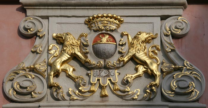 Das Wappen von Eltz in einem von teilvergoldeten Voluten gerahmten Feld über dem Hauptportal, gehalten von zwei Löwen als Schildhaltern: Rot-silbern geteilt, oben wachsend ein goldener Löwe, Helmzier wäre ein hermelingestulpter roter Turnierhut, darauf der Löwe wachsend zwischen einem mit silbernen (auch als golden beschrieben) Lindenblättern (oder Herzen) bestreuten roten Flug. Helmdecken rot-golden (resp. rot-silbern). Hier ist stattdessen eine neunzinkige Rangkrone abgebildet (Grafenkrone). Unter dem Wappen das Baujahr 1726.