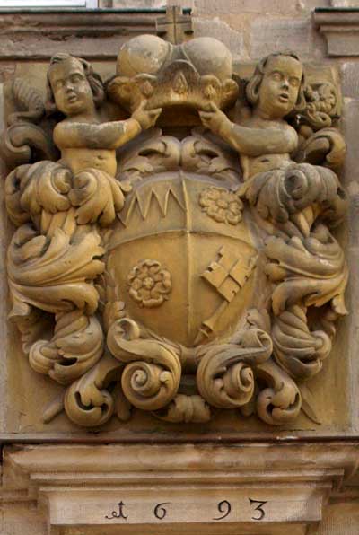 Das Portal zeigt zwei markante Fratzen, die sich im Schlußstein wiederholen, darüber ist das Jahr der Vollendung eingemeißelt: 1693. Über dem Eingangstor ist das Wappen des Würzburger Fürstbischofs Johann Gottfried von Guttenberg (reg. 1684-1698) dargestellt, also des zur Zeit der Errichtung herrschenden Fürstbischofs. Das Stammwappen derer von Guttenberg findet sich in den Feldern 2 und 3. Es zeigt in Blau eine goldene Rose mit eigentlich doppelter Blattlage und mit goldenem Butzen. Feld 1: "Fränkischer Rechen" = von Rot und Silber mit drei aufsteigenden Spitzen geteilt, Herzogtum zu Franken, Feld 4: "Rennfähnlein" = in Blau eine rot-silbern gevierte, an den beiden senkrechten Seiten je zweimal eingekerbte, schräggestellte Standarte mit goldenem Schaft, Hochstift Würzburg. Aus den helmdeckenartigen seitlichen Ornamenten, die mangels Helm keine echten Helmdecken sind, wachsen zwei Putten hervor, die über der von einem Laubkranz eingerahmten Kartusche einen Fürsten- oder Herzogshut halten. Hinter den beiden Putten ragen seitlich das gestürzte Schwert und der Krummstab hervor.