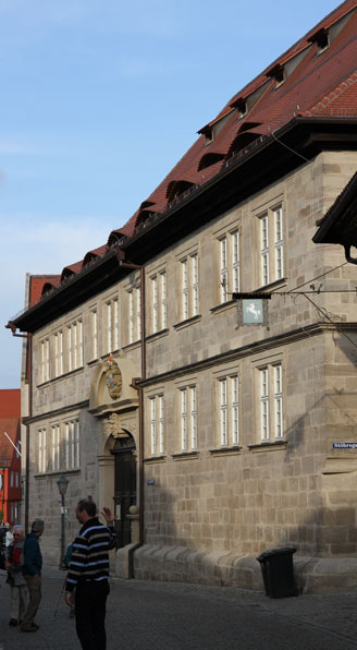 Dieser Bau im Zentrum von Iphofen wurde 1688-1693 erbaut als Wirtshaus (Schenkstatt, "gmeiner Statt Wirtzhauses zum geharnischten Mann") der Stadt Iphofen. Vom Stil her ist das Gebäude zwar noch stark von der ausklingenden Renaissance beeinflußt, im Wesen deutet es aber schon den künstlerischen Aufbruch in das barocke Zeitalter an. Das Anwesen gilt als der erste Barockbau Iphofens. Zwischenzeitlich (1716-1718) wurden hier auch Ratssitzungen der Stadt Iphofen abgehalten, als das Rathaus gerade neu errichtet wurde. Ab 1723 war es das fürstbischöfliche Amtshaus und die Kellerei, nachdem der ganze Komplex im Austausch gegen den Zehntkeller und mit Aufzahlung von 4200 Gulden an den Fürstbischof von Würzburg überging. Nach der Säkularisation und der Abwicklung des Fürstbistums Würzburg war dieses Gebäude erst im Besitz der Kurfürsten von Bayern, dann von Preußen, dann in französischem Besitz (Tilsiter Friedensvertrag), seit 1810 endgültig im Besitz Bayerns. Hier war seit 1805 der Sitz des Landgericht-Rentamts, seit 1857 des Forstamts. 1967 wurde das Anwesen von der Fa. Knauf Gips KG erworben, die es erst für Büroräume nutzte.