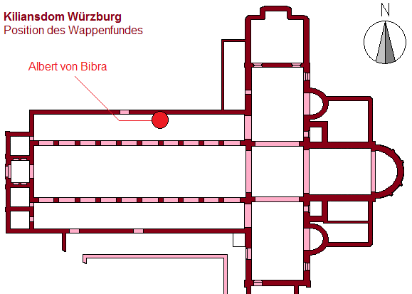 Dieser Grabplattenbeschlag aus Bronze, der heute die Wand eines Seitenschiffes im Würzburger Kiliansdom ziert, erinnert an Albert von Bibra (1464-1511, je nach Quelle auch Albanus oder Albrecht von Bibra genannt). Die Beschläge messen 230 cm in der Höhe und 111 cm in der Breite. Er trat 1483 als Domicellar in Würzburg in die Klerikerlaufbahn ein und schwor am 7.10. auf. 1484 wurde er Pfarrer in Wettringen. Am 16.8.1496 wurde er Propst am Neumünsterstift, und 1502 wurde er Dompropst in Würzburg. Auch in Bamberg war er Domherr (Domkanonikat 1486-1501), und er amtierte noch als Oberpfarrer in Röttingen. Ein weiteres Kanonikat bestand im Liebfrauenstift in Mainz und in der Nikolaus-Vikarie in St. Sebald in Nürnberg. Er verstarb am 24.8.1511. Die umlaufende erhabene Inschrift, von der im optisch oberen linken Teil ein ganzes Stück fehlt, lautet wie folgt: "Anno d(omi)ni M CCCCC XI (1511) die solis vi(g)esi(m)a quarta Augusti obiit Reverend(us) pater Albertus de bibra maioris et sancti Johannis novi monasterii (= Stift Neumünster) herb(ipole)n(sium) eccl(es)iar(um) pr(a)eposi(tus cuius anima requiescat) i(n) s(an)c(t)a pace ame(n)." Die Inschrift ist in gotischen Minuskeln ausgeführt. Innerhalb dieses von der Inschrift gebildeten Rahmens steht das nur an der unteren Seite mit ersterem verbundene Standportrait des Klerikers mit einem Abendmahlskelch in der Linken, in typischer Geste die Rechte mit zwei ausgestreckten Fingern segnend darüber erhoben. Er trägt Chormantel und Birett. Der Raum zwischen Kopf und oberem Abschluß ist mit spätgotischem Sprengwerk gefüllt. Die aus der Nürnberger Vischer-Werkstatt stammende Platte wurde am 16.3.1945 durch Bombentreffer beschädigt.