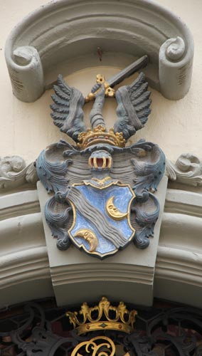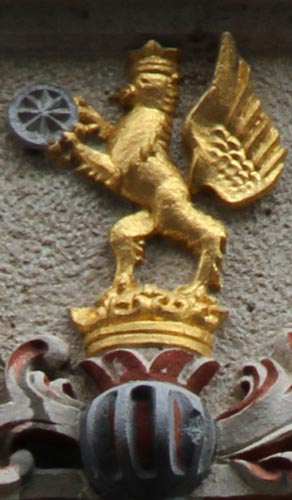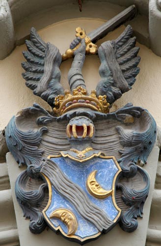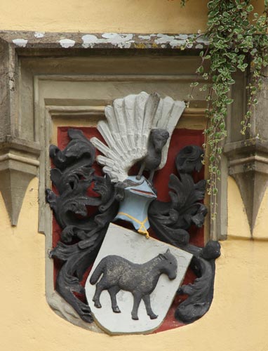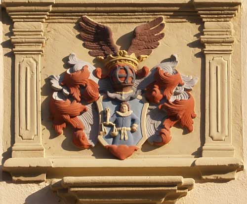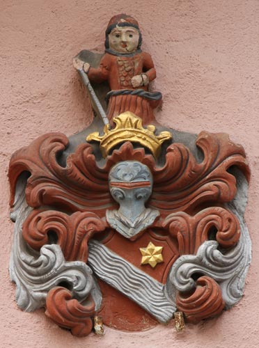 Unter den Fenstern des ersten Obergeschosses befindet sich auf der linken Seite ein "Wagner 1628" bezeichnetes Wappen, geviert, Feld 1 und 4: in Blau ein goldener, gekrönter Greif oder Löwengreif (?), der in seinen Vorderpranken ein sechsspeichiges Rad hält, Feld 2: in Silber zwei rote Balken, Feld 3: rot-silbern im Schrägzinnenschnitt schräggeteilt, auf dem gekrönten Helm mit rot-silbernen Decken die Figur aus Feld 1 (Beschreibung nach Augenschein, Hinweise zu Literaturquellen willkommen).