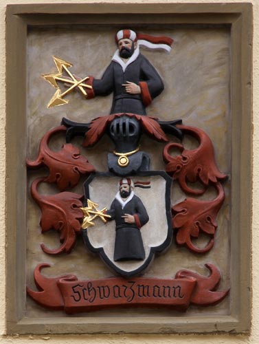 Das redende Wappen der Familie Schwarzmann befindet sich am Hotel Eisenhut in der Herrngasse 7, einem im Kern mittelalterlichen Bau, der seine heutige Gestalt im 18. Jh. erhielt. Es ist ein dreigeschossiger, verputzter Bau mit steilem Satteldach und einem Zwerchhaus zwischen zwei Dachgauben. Das Wappen zeigt in Silber einen Männerrumpf (Dreiviertelfigur), schwarz gewandet mit silbernem Kragenaufschlag und roten Ärmelaufschlägen, in der Rechten drei goldene Pfeile, auf dem Kopf eine rot-silberne turbanartige Mütze oder Kopfbinde mit zwei nach hinten flatternden, roten und silbernen Bändern. Die Helmzier ist der wie im Schild bez. Mann wachsend. Das Wappen wird im Schragschen Geschlechterbuch abgebildet, mit geringen Farbvariationen. Weitere Darstellungen sind im Siebmacher Band Bg1 Seite: 42 Tafel: 57, und bei Schöler, Familienwappen Seite 100 und Tafel 114 Nr. 10. Die Stammreihe beginnt bei Schrag mit Leonhard Schwarzmann von Bullenheim, Innerer Richter zu Rothenburg, der in der ersten Hälfte des 16. Jh. lebte.