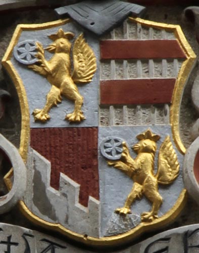 Das vorherige und das nachfolgend beschriebene Wappen befinden sich an zwei benachbarten Häusern in der Herrngasse, ersteres am linken Haus (Herrngasse 16, ein vor 1600 entstandener, dreigeschossiger Massivbau mit Halbwalmdach und hoher Toreinfahrt), letzteres am rechten Haus (Herrngasse 14, ein im 18. Jh. überformter, dreigeschossiger Traufseitbau mit Satteldach und Krangaube mit älterem Kern), welches ein Patrizierhaus der Familie Schertling war, das zuletzt im Besitz der Familie Renger war.