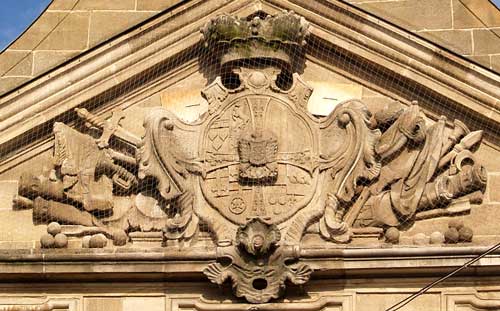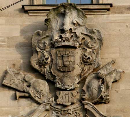 Das Wappen im dreieckigen Giebelfeld ist das des Deutsch- und Hochmeisters Clemens August Herzog von Bayern (geb. 16.8.1700 in Brüssel, Sohn des Kurfürsten Maximilian Emanuel von Bayern und der polnischen Prinzessin Sobieska, damit Enkel des Königs Johann von Polen, Priesterweihe 1727, Inhaber diverser Bistümer, reg. 17.7.1732-6.2.1761 als Hochmeister in Mergentheim, gest. 6.2.1761 in Koblenz-Ehrenbreitstein). Ein ähnliches Wappen befindet sich an der Fassade der Schloßkirche von Ellingen, nur mit anderem, korrektem Herzschild (Wittelsbacher Rauten geviert mit Pfälzer Löwen, Näheres siehe dort).