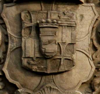 Im Detail drückt dieses Prunkwappen weitere Würden dieses Hochmeisters aus: Erzbischof von Köln (1723-1761), Bischof/Erzbischof von Münster (1719-1761), Osnabrück (1728-1761), Hildesheim (1724-1761) und Paderborn (1719-1761). Man beachte die Vielzahl kriegerischen Geräts und den stattlichen Vorrat an Kanonenkugeln auf dem Gesims. Dem Hauptschild liegt das Hochmeisterkreuz auf, darauf liegt noch einmal ein kleiner Herzschild, und hier stimmt etwas nicht, denn hier ist er nicht mit dem gevierten Inhalt der Herzöge von Bayern versehen, sondern mit einem Rad. Das eigentliche Stammwappen taucht hier überhaupt nicht auf, es ist durch und durch ein Funktionswappen, das aber in seiner typischen Konstellation genau diese eine Person zu definieren dennoch geeignet ist. Ein Rad taucht sehr wohl in diesem Wappen für Osnabrück auf, das ist auch korrekt. Nur im Herzschild hat es nichts zu suchen, denn eine so herausgehobene Stellung im Vergleich zu den anderen vier wäre durch nichts legitimiert. Andererseits fehlt eine Familienkomponente dadurch gänzlich, auch dies ein absolut unplausibler Zustand. Es steht zu vermuten, daß hier bei der einer Rekonstruktion gleichkommenden Wiederherstellung 1950 ein schwerer Fehler passiert ist, indem man sich am Wappen von St. Georg orientierte, nur dort hat das Rad im Herzschild eine gänzlich andere Bedeutung und ist berechtigt, hier jedoch nicht.