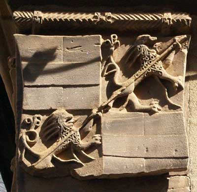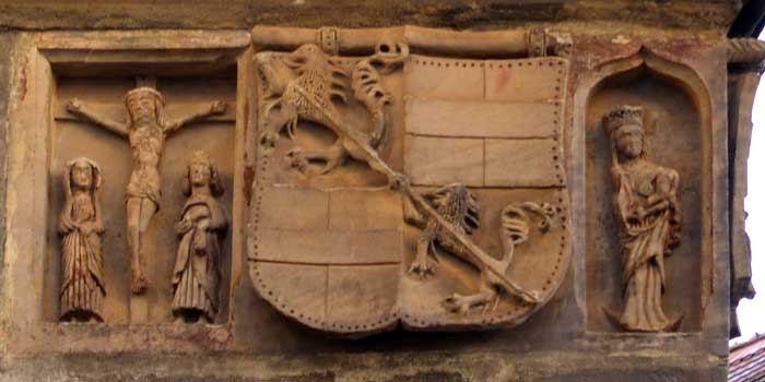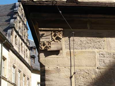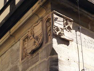 Dieses Wappenpaar ziert die spitze westliche Ecke der Alten Hofhaltung in Bamberg. Zwei gleiche Wappen zieren die Ecksteinflächen auf jeder Seite. Interessant ist die Stellung. Hier ist das optisch linke Wappen korrekt dargestellt, das optisch rechte Wappen aber ist insgesamt gewendet mit seinen Löwen. Warum? Warum neigen sich nicht die Wappen einander zu?