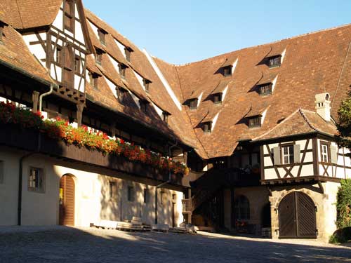 Ansicht des Innenhofes der Alten Hofhaltung zu Bamberg mit Blick auf die spätgotischen Verwaltungs- und Speichergebäude.