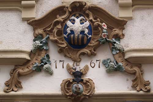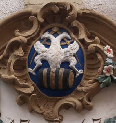 Das Zunfthaus der Faßbinder und Küfer befindet sich in der Jakobstraße 32. Im Kern war das ein gotisches Haus, das später (1767) umgebaut wurde. Davon ist aber nur noch das Zunftwappen vorhanden. Schön bis kitschig die verspielte Gestaltung mit Blümchen und Weinreben, schließlich befinden wir uns in einem Kernland guter Weine, wo das Faßbinder- und Küferhandwerk eines der wichtigsten überhaupt ist.