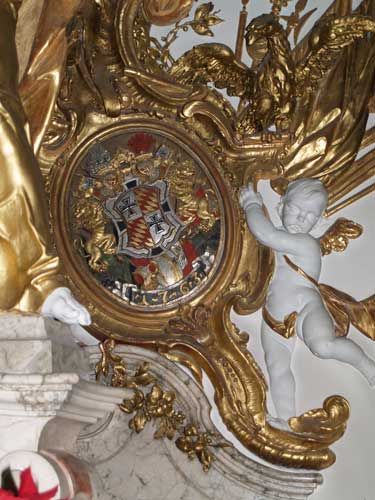 Opulente Rokoko-Kartusche mit dem Wappen des Landkomturs rechterhand hinter dem Hochaltar im Chor der Kirche St. Michael, gefertigt aus Holz, datiert auf 1763.