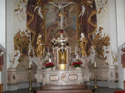 Blick auf den Hochaltar. Links davon die Rokoko-Zier-Kartusche mit dem Hochmeisterwappen, rechts die mit dem Wappen des Landkomturs.