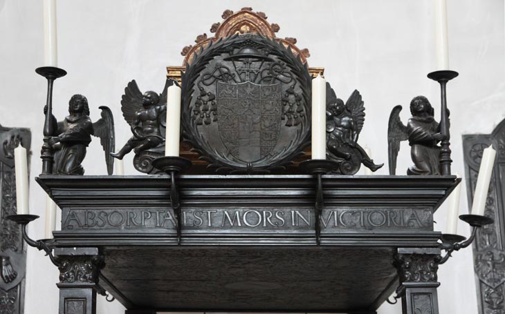 Auf dem Gebälk läuft eine Inschrift um des Wortlauts "ABSORPTA EST MORS IN VICTORIA IDEO LAETATVS SVM HIS QVAE DICTA SVNT MIHI IN DOMVM DOMINI IBIM(VS) HEC EST HEREDITAS D(OMINI) CV(M) DEDE(RIT) DILEC(TIS) SVIS SO(M)NV(M)". Das ist ein Verschnitt mehrerer vertrauter Bibelzeilen. In Paulus, 1. Korinther 15, 55-56 findet man "absorpta est mors in victoria" - verschlungen ist durch den Sieg des Lebens der Tod. In Psalm 121:6 findet man "Laetatus sum in his quae dicta sunt mihi: In domum Domini ibimus" - ich freute mich darüber, als man mir sagte: Lasset uns ins Haus des Herrn gehen. Psalm 127 gibt uns "cum dederit dilectis suis somnum" - denn seinen Freunden gibt er es schlafend. Und "Hec est (oder: ecce) haereditas Domini" stammt aus Psalm 126:3.
