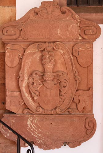 Im in Richtung auf den Stiftsplatz zu vorgebauten äußeren Umgang vor der Westfassade der Stiftskirche St. Peter und Alexander befindet sich im westlichen Abschnitt direkt neben dem Kircheneingang das Epitaph für Kaspar Magnus Lerch von und zu Dirmstein (28.5.1610-16.2.1630) aus rotem Sandstein. Der Verstorbene war kaiserlicher Wachtmeister ("magister vigiliarum militum") unter Ferdinand II. Seine Eltern waren Kaspar IV. Lerch von Dirmstein (1575-1642), kurmainzischer Rat und Amtmann in Tauberbischofsheim sowie Ritterhauptmann am Oberrhein, und Martha Brendel von Homburg, und laut Inschrift waren es diese, die ihrem jung an einer Krankheit verstorbenen Sohn dieses Denkmal setzten.