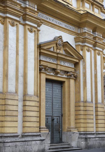 Die Fassade besitzt eine mehrteilige Inschrift, deren erster Teil oben auf dem Gebälk über den ionischen Pilastern des Obergeschosses verläuft, deren zweiter Teil sich auf den Friesstreifen unterhalb der Volutenbögen und dem Gebälk des Untergeschosses erstreckt und deren dritter Teil mit der Datierung über dem Hauptportal zu finden ist. Sie lautet: "MUNIFICA EMIN(ENTISSI)MI PRINCIPIS IOANNIS PHILIPPI LIBERALITATE / PIA MAGNATUM OPE / CIVIUM PATRATA / RELIGIONIS STUDIO / DEO O(PTIMO). M(AXIMO). AD HONORE(M) SS. IOSEPH(I) ET M(ARIAE). MAGDALENAE HAEC STAT DOMUS / ANNO DOMINI MDCLXVIII". Das bedeutet: Dieses Haus, vollendet durch die freigebige Gesinnung des hochwürdigsten Fürsten Johann Philipp, durch den frommen Beistand der Vornehmen und durch den Eifer der Bürger für die Religion, steht für den allerhöchsten Gott zu Ehren des heiligen Josephs und der heiligen Maria Magdalena.