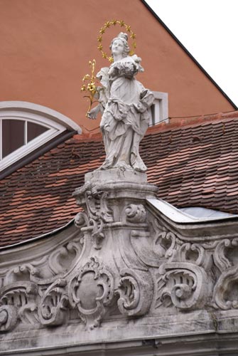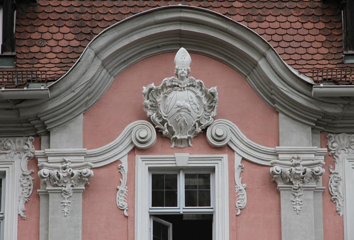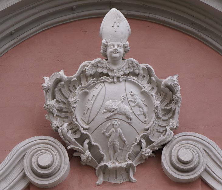Über dem mittleren Fenster des zweiten Obergeschosses befindet sich, von zwei kräftigen Voluten gestützt, das Wappen des Ebracher Abtes Hieronymus II. Held, dessen Wappen auch mehrfach am Kloster Ebrach gefunden werden kann. Er lenkte als 47. Abt die Geschicke der Abtei und vollendete deren barocken Neubau. Er wurde am 2.2.1694 geboren und stammte aus Gerolzhofen; sein Geburtsname war Johann Franz Balthasar Held. Als Abt amtierte er von seiner Wahl am 16.5.1741 bis zu seinem Tod am 20.10.1773. Im Jahre 1743 wurde Hieronymus Held vom Generalabt des Zisterzienserordens, Andoche Pernot des Crots, zum Generalvikar für Franken ernannt. Er vollendete auch die Abteigärten und die Ökonomiegebäude in Ebrach und ergänzte so den äußeren Rahmen der unter seinem Vorgänger geschaffenen Neubauten. Dort ist sein Wappen am Herkules-Brunnen, an der Kellermauer und im Mönchschorgitter (Lettneraufsatz) der Ebracher Abteikirche zu finden. Weiterhin taucht es in Sulzheim am ehemaligen Gasthof zum Adler auf und an der Kanzel in Burgwindheim und im Stuck der dortigen Kirche St. Jakobus, die der Abt ausschmücken ließ. In Ebrach ließ dieser Abt ferner den Wächterturm errichten, der die Südwestecke des Klosterbezirkes schützte. Weiterhin ließ er den Amtshof in Koppenwind neu bauen, alles in allem ein sehr baufreudiger Abt.