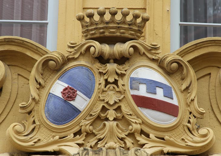 Über dem Portal ist ein Allianzwappen aus zwei einander schräg zugeneigten Ovalkartuschen zu sehen, in der Mitte überhöht von einer siebenperligen Rangkrone (freiherrliche Krone). Heraldisch rechts ist das Wappen der von Aufseß zu sehen, in Blau ein silberner Balken, belegt mit einer roten Rose (Scheiblersches Wappenbuch Folio 147, Siebmacher Band: Bay Seite: 26 Tafel: 21, Band: ThüA Seite: 72 Tafel: 56, Rahrbach S. 8-10, Berliner Wappenbuch). Die zugehörige, hier aber nicht dargestellte Helmzier wäre zu blau-silbernen Decken ein Pfauenstoß (ggf. auf einem goldenen Halter) zwischen zwei wie der Schild bez. Büffelhörnern.