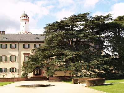 Im 17. Jahrhundert wurde im Osten des Schlosses ein Parterre mit einem formalen Garten im Stile des Barocks angelegt. 1770 wandelte sich der Geschmack wieder, und große Teile davon wurden in einen Landschaftgarten nach dem Vorbild englischer Parks umgestaltet, ebenso die tiefergelegenen Parkanlagen und Teiche; Hofgärtner Johann Adam Wittmann war dafür verantwortlich. Im 19. Jh. vereinfachte man diesen Park weiter und pflanzte bevorzugt exotische Bäume, im Bild die gigantischen Libanon-Zedern vor der Ostfront des Schlosses, die mittlerweile über 187 Jahre alt sind, denn die Landgräfin Elisabeth, deren Wappen wir oben diskutiert haben, bezog sie im Jahre 1820 aus den Kew Gardens in ihrer Heimat. Ab 1870 unter preußischer Regie wurden im Nordteil wieder regelmäßige Beete angelegt.