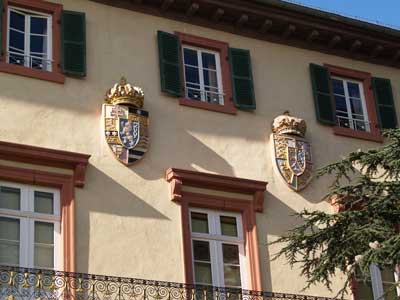 Blick auf die Fassade des Königsflügels mit den beiden nebeneinander eingemauerten Wappensteinen.