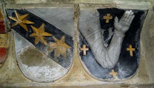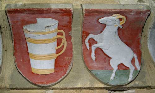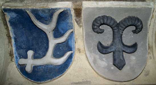 Grafen von Montfort (In Silber eine dreiflügelige rote Kirchenfahne an drei Ringen. Helmzier eine rote Inful mit zwei silbernen Kugeln an den Spitzen, Var. Bischofsmütze, Helmdecken rot-silbern), Grafen von Leiningen (in Blau drei (2:1) silberne Adler, Helmzier ein grüner Baum, früher mit silbernen Blüten, später mit goldenen Äpfeln, Helmdecken blau-silbern)