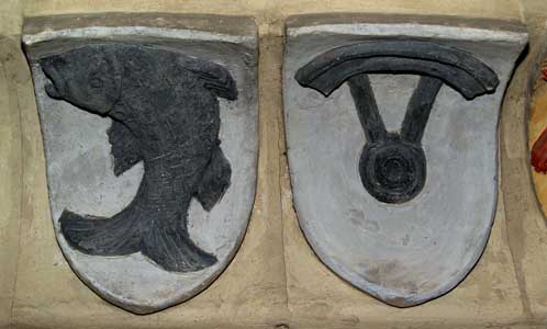 von Fischborn (in Silber ein schwarzer, mit dem Kopf nach oben gerichteter, gekrümmter Fisch, Helmzier ein grüner Baum mit quer darüber gelegtem schwarzem Fisch. Helmdecken schwarz-silbern. Hessisch-fränkisches Geschlecht mit seinem Ursprung im Amte Dirnstein im Lippischen (nach Heideloff Baum silbern, nach Aschaffenburger Wappenbuch grün, alter Siebmacher Band 2, Tafel 80), Truchseß von Rieneck (In Silber ein Bruchstück eines schwarzen Rades mit zwei Speichen. Helmzier ein schwarz-silbern schräg geteilter Flug, oder ein Flug, vorne silbern, hinten schwarz. Helmdecken schwarz-silbern. Wappengenossen der Herren von Randersacker)