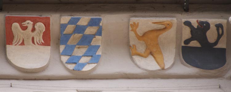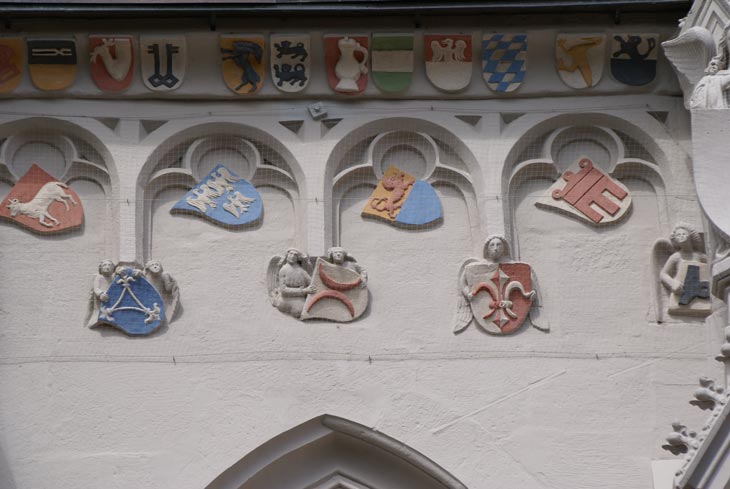 3. Abschnitt: Südseite, dritter Wandabschnitt von links, Detailaufnahmen obere Reihe, rechter Abschnitt, von links nach rechts: Truchseß von Holenstein (rot-silbern geteilt, oben ein aus der Teilung wachsender silberner Adler; die Helmzier wäre zu rot-silbernen Decken ein silberner Adler; Siebmacher listet noch eine andere Farbvariante nach dem Rumohrschen Wappenbuch), Herzöge von Bayern (von Silber und Blau schräggerautet; die Helmzier wäre zu blau-silbernen Decken ein silbern-blau schräggerauteter Flug), von Kranichfeld (in Silber ein goldener Kranich; die Helmzier wäre zu rot-goldenen Decken ein golden-rot-silbern mehrfach schräglinksgestreifter Kranich, in dieser Form vom Fürstenhaus Reuß in das Wappen aufgenommen), von Rosenbach (von Silber und Schwarz geteilt, oben aus der Teilung hervorkommend ein schwarzer, rotgezungter, golden gekrönter Löwe; die Helmzier wäre zu schwarz-silbernen Decken zwischen zwei silbern-schwarz geteilten Büffelhörnern ein wachsender, schwarzer, rotgezungter, golden gekrönter Löwe).