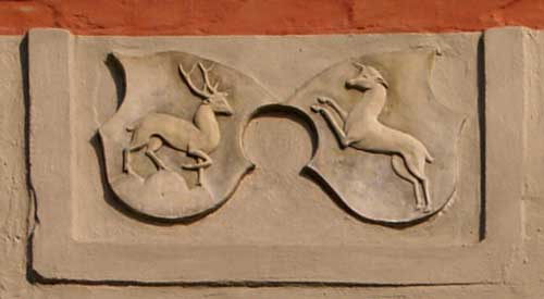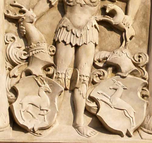 Das Allianzwappen Thuner/Fugger findet sich im zweiten Erkergeschoß unter der Fensterbrüstung wieder, links der Hirsch, rechts das Reh.