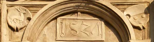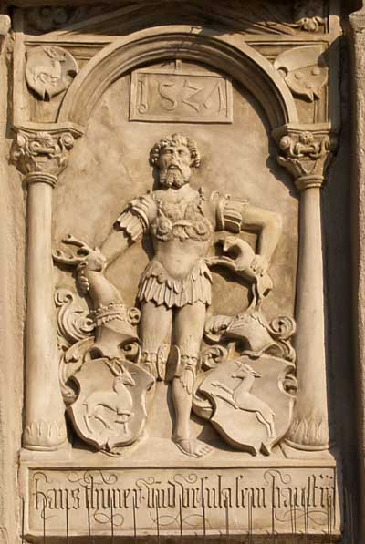 Der prächtigste Wappenstein befindet sich unten am umgebauten Erker: Der Stein ist auf 1527 datiert und zeigt ein Allianzwappen von Hans Thuner und seiner Frau, einer geborenen Fugger vom Reh. Die beiden Wappen passen hervorragend zueinander, der Ehemann hat den Hirsch, die Ehefrau das Reh darauf nimmt auch die Inschrift humorvoll Bezug, die lautet hans thuner und ursula sein haustir das kann auch höchst diskriminierend verstanden werden, ist aber einfach nur eine Anspielung auf die sich trefflich ergänzenden Wappen.