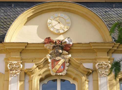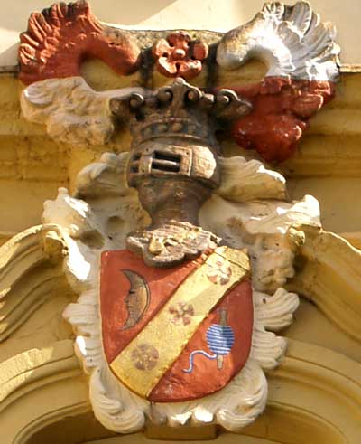 Zum gekrönten Stammhelm gehört ein rot-silbern übereck geteilter Adlerflug, dazwischen eine rote, golden besamte Rose. Helmdecken rot-golden/rot-silbern. Hier ist der Flug rot-weiß gestrichen, die Helmdecken bzw. die daran erinnernden Rudimente, ebenfalls weiß. Soweit die Wappenform von 1714 mit nur einer Helmzier, wie am Quinter Schloß realisiert.