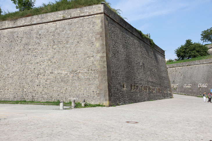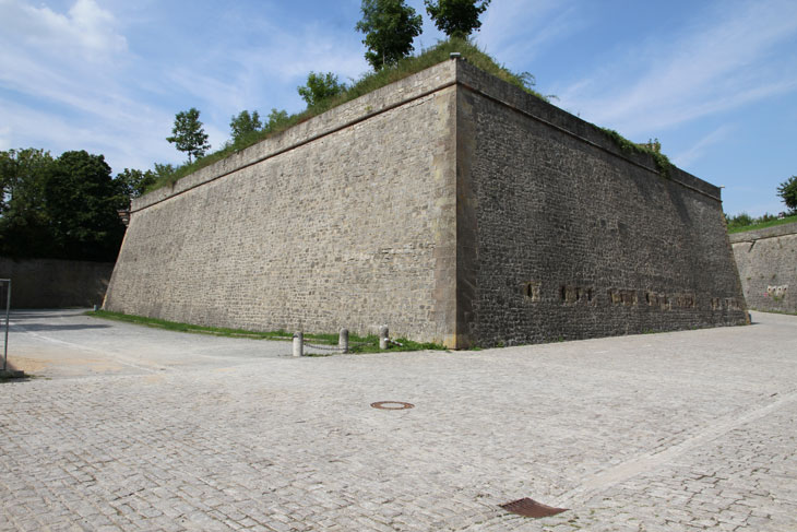 gleichermaßen wie die Bastionen geböschte Mauer, die den