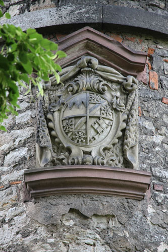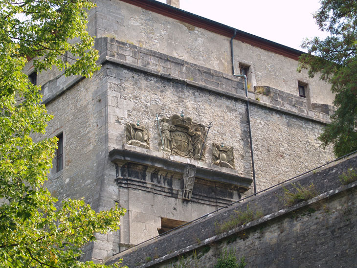 An der Nordface des Reichsravelins ist das Wappen des Fürstbischofs Peter Philipp von Dernbach (reg. 1675-1683) angebracht (Wappenfundstelle Nr. 79). Sein Wappen hat die ab 1675 gebräuchliche Form mit beiden Fürstbistümern und ist geviert mit Herzschild, Feld 1 und 4: in Gold ein rotbewehrter und rotgezungter, schwarzer Löwe, überdeckt von einer silbernen Schrägleiste, Hochstift Bamberg, Feld 2: "Fränkischer Rechen" = von Rot und Silber mit drei aufsteigenden Spitzen geteilt, Herzogtum zu Franken, Feld 3: "Rennfähnlein" = in Blau eine rot-silbern gevierte und an den beiden senkrechten Seiten je zweimal eingekerbte, schräggestellte Standarte mit goldenem Schaft, Hochstift Würzburg, Herzschild: in Blau drei deichselförmig zusammengestellte goldene Seeblätter, begleitet von goldenen Schindeln, Stammwappen der Grafen von Dernbach. Drei Jahre bevor er den Würzburger Bischofsstuhl bestieg, war er bereits Fürstbischof von Bamberg geworden.