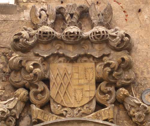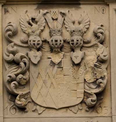Abb.: Das Wappen am westlichen Torgebäude. Das Wappen ist ein Ehewappen, ein sog. zusammengeschobenes Wappen, und gespalten:
