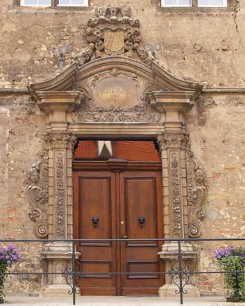 Abb.: Blick auf das barocke Innenhofportal am Westflügel über einer doppelläufigen Freitreppe, reich gegliedert, genau in der Mittelachse befindlich. Die Bauinschrift lautet: DOMINE REFUGIUM FACTUS ES NOBIS A GENEATIONE IN GENERATIONE ANNO MDCLXIII Herr, du bist für uns von Generation zu Generation Zuflucht, Anno 1663. Trotz dieser Jahreszahl ist das Portal aber erst 1680-1690 eingefügt worden. Beschreibung wie oben.