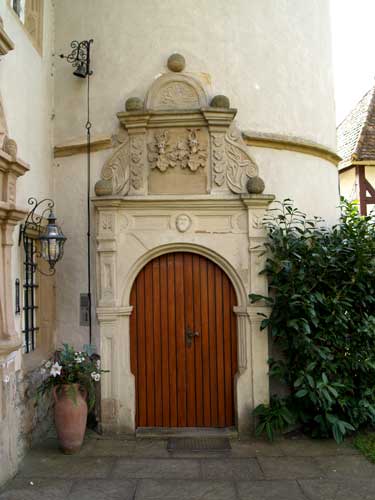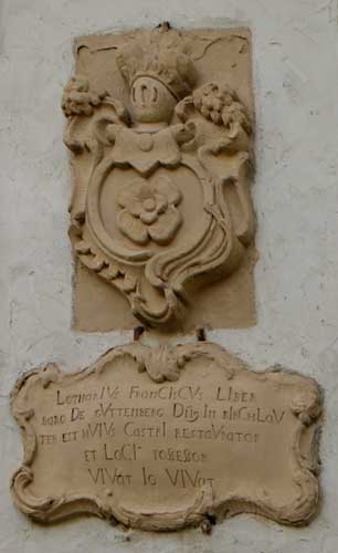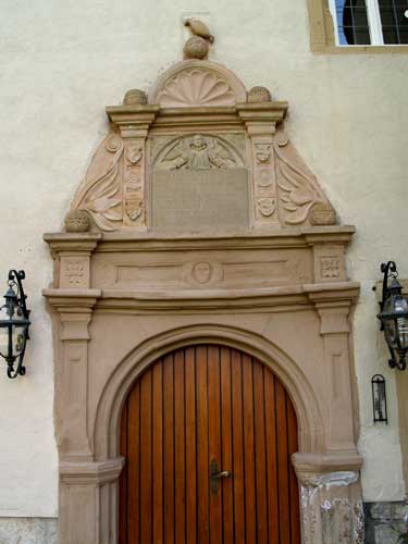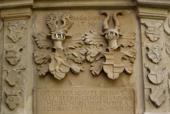 Über der Inschrift des auf 1590 datierten Portales befindet sich das Allianzwappen Bibra / Erthal, beide als Vollwappen dargestellt. Interessant der Stil der Helmdecken - flächig ausgebreitet, ohne eingeschlagen zu sein. Zu beiden Seiten wird das Allianzwappen von einer vierschildrigen Ahnenprobe eingerahmt, links vier für die vier Großeltern des Ehemannes, Heinrich v. Bibra (Namenszuordnung nach Biedermanns Geschlechtsregister Steigerwald BIBRA TAB. XI und XII):