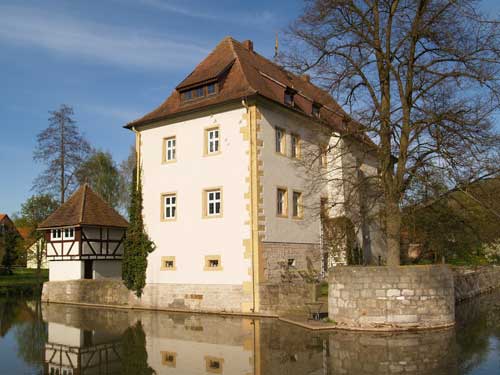 Klein-was? Kleinbardorf im Landkreis Rhön-Grabfeld wird den wenigsten Franken-Reisenden ein Begriff sein. Im Westen von Bad Königshofen und am nordwestlichen Rande des Naturparks Haßberge gelegen, ist es ein kleiner Ort, dessen Hauptsehenswürdigkeit, das noch bewohnte und gut instandgehaltene Wasserschloß, abseits der Besucherströme eine Aura von Privatheit und Authentizität besitzt wie nur wenige andere Schlösser Frankens. Wie aber anhand der Wappen zu sehen ist, hat dieses Wasserschloß durchaus seine Position im Netz reichsritterschaftlicher Besitzungen und Familienbande.