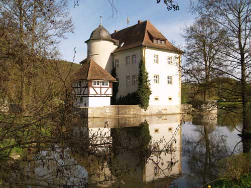Das Wasserschloß liegt auf einer Insel mitten in einem künstlichen See. Die Insel ist eine mehr oder weniger quadratische Plattform, denn die einst wehrhaften Außenmauern sind auf Brüstungshöhe niedergelegt, und auch von den einst vier Türmen hat nur einer eine nennenswerte Höhe mit Fachwerkaufbau und Dach, ein anderer ist nur noch eine niedrige Rundbastei im Südwesten. Der Zugang führt über eine Steinbrücke im Osten, hier im Photo nicht sichtbar. Sie wird von vier Sandsteinpfeilern mit Kugelaufsätzen flankiert. Hervorgegangen ist das Schloß aus einer alten Zollstätte der mächtigen Grafen von Henneberg. 1368 erwarb das Hochstift Würzburg diese Zollstätte, 1378 dann erwarben sie Dietrich und Konrad von Bibra. Der Besitz der Familie von Bibra in Kleinbardorf wurde durch Zukauf stetig vergrößert. 1508 unterwarf sich Hans von Bibra der Lehenshoheit des Hochstiftes Würzburg. Genau aus diesem Rechtsverhältnis gab es 1602 Streit, als der kinderlose Heinrich von Bibra verstarb - aber damit nur diese eine Linie der von Bibra endete, denn das Geschlecht blühte in anderen Linien weiter fort, und diese hätten den Besitz schon gerne gehabt. Aber das Hochstift Würzburg sah das alles ganz anders und zog das Lehen ein. Vor dem Reichsgericht wurde bis zum Jahre 1681 deswegen prozessiert, es endete aber mit einem Sieg der Familie von Bibra, die den Besitz wieder zugesprochen bekamen. Genau dieser Heinrich von Bibra war es auch, der den heute noch erhaltenen Hauptbau im Stile der Renaissance 1589/90 hat erbauen lassen.