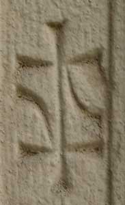 Hier das Steinmetzzeichen des Portales in typischer Renaissance-Manier mit keilförmig verbreiterten Enden und gebogenen Elementen, hier zu einem symmetrischen Zeichen mit Inversionszentrum zusammengefügt: