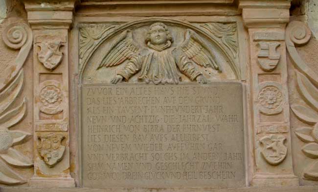 Am Hauptportal findet sich die Inschrift: "ZVVOR EIN ALTES HAVS HIE STVND / DAS LIES ABBRECHEN AVF DEN GRVND / ALS EIN TAVSENT FVNFHVNDERT JAHR / NEVN VND ACHTZIG DIE JAHRZAL WAHR / HEINRICH VON BIBRA DER EHRNVEST / LIES DIESEN BAV AVFS ALLERBEST / VON NEVEM WIEDER AVFFVHRN GAR / VND VERBRACHT SOLCHS IM ANDERN JAHR / SEIN NAMEN VND GESCHLECHT ZV EHRN / GOT WOL DREIN GLVCK VND HEIL BESCHERN"