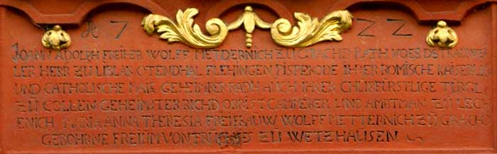 Der Besitz Flehingen wurde den Wolff-Metternich zur Gracht nach dem Aussterben der Herren von Flehingen 1638 von Kurfürst Maximilian von Bayern verliehen. Das Wappen ist auf 1722 datiert, also noch im Zustand des Reichsfreiherrenstandes. Es handelt sich aber schon um den Johann Adolf Wolff-Metternich zur Gracht, kurkölnischer Geheimrat, Reichshofrat und Landhofmeister, der ein wenig später den Grafenstand erlangte.