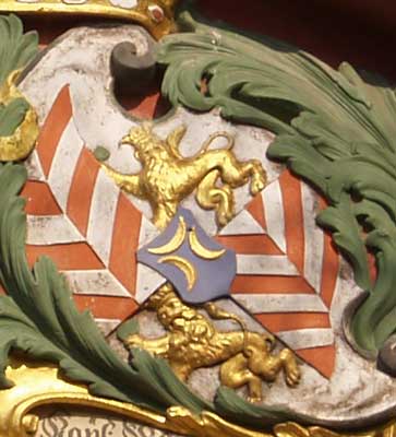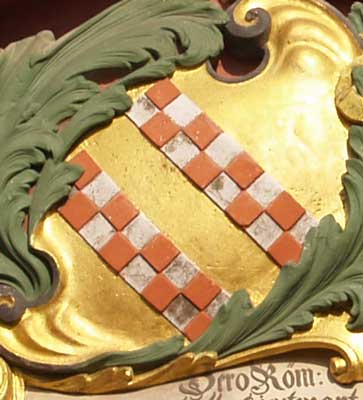 Nun zu den hölzernen Denkmälern im Herrschaftsstand: Es handelt sich um 13 plastisch geschnitzte Denkmäler und um 7 flächige Tafeln sehr unterschiedlichen Types. Zum einen haben wir wie bei klassischen Totenschilden, nur nicht in runder Form, eine Erinnerungsinschrift in einer Kartusche und obendrüber das Wappen des Verstorbenen (3 Beispiele). Dieses kann durch 4 Beiwappen wie bei einer Ahnenprobe ergänzt sein (1 Beispiel). Die überwiegende Anzahl der Tafeln präsentiert ein Ehewappen und nennt in der Inschrift beide Ehepartner. Bei zweimal Verheirateten wird das Wappen des Ehemannes von denen beider Ehefrauen flankiert (1 Beispiel). Dazu kommen noch weitere 7 Erinnerungen in Form von Vasen oder Rokoko-Kartuschen und Sonderformen. Im einzelnen finden wir folgende Wappen: