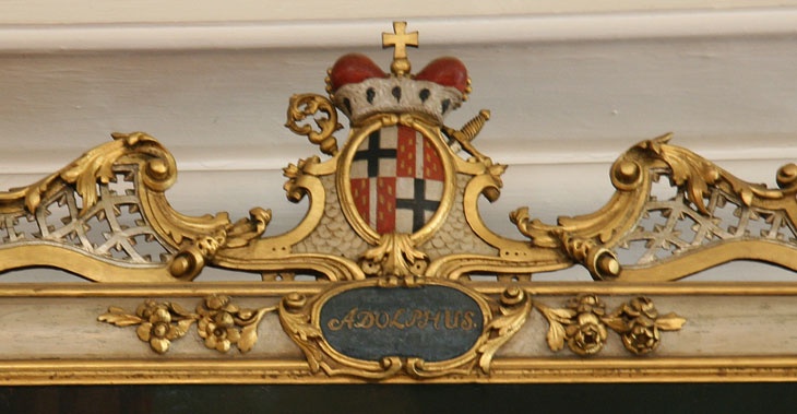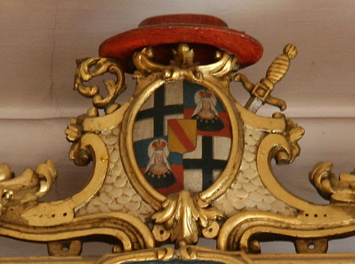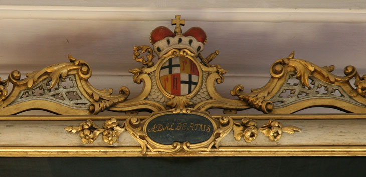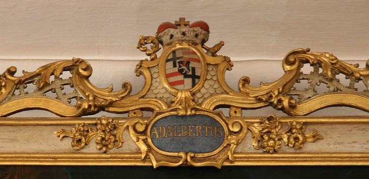 Adalbert II. von Walderdorff (regierte 1757-1759), Fürstbischof, Eltern: Karl Lothar Freiherr von Walderdorff, Anna Katharina Elisabeth Freiin von Kesselstadt, Großeltern für die 4er-Ahnenprobe in den Ecken des Bilderrahmens: Georg Friedrich von Walderdorff, Johanna Elisabeth Frey von Dehrn (falsches Wappen, Niederisenburg statt Frey von Dehrn), Johann Eberhard Freiherr von Kesselstatt, Anna Antoinetta von Orsbeck.