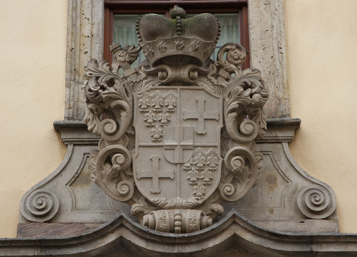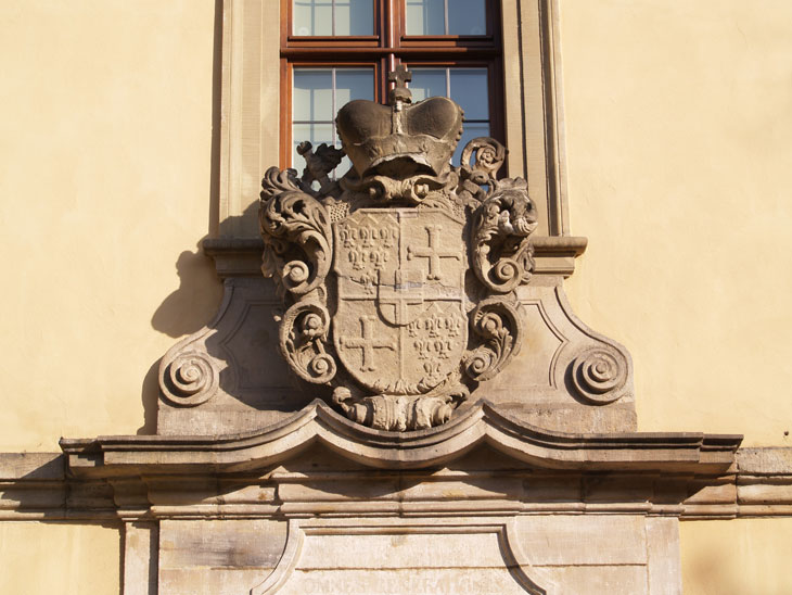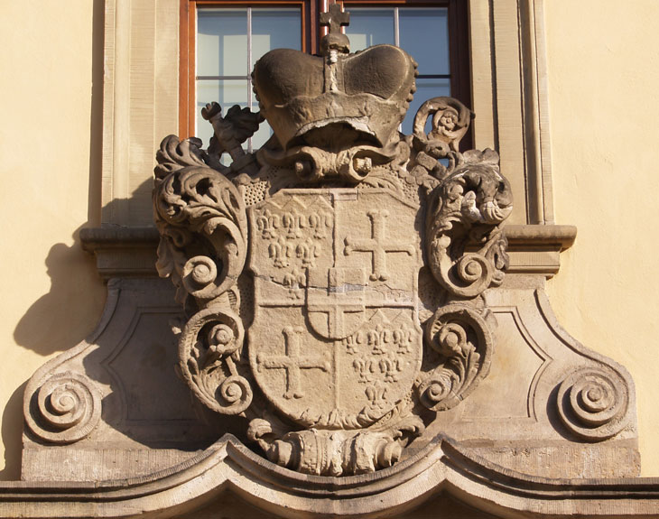 Das Wappen des Fuldaer Fürstabtes Adolf von Dalberg (1726-1737), hier dasjenige im Innenhof (Museumshof), ist wie folgt aufgebaut: Hauptschild geviert, Feld 1 und 4: unter einem goldenen Schildhaupt, in das drei blaue Spitzen aufwärtssteigen, in Blau 6 (3:2:1) silberne Lilien (Stammwappen der Kämmerer von Worms), Feld 2 und 3: in Gold ein schwarzes Ankerkreuz (Stammwappen der von Dalberg), Herzschild: in Silber ein schwarzes durchgehendes Kreuz (Fürstabtei Fulda).