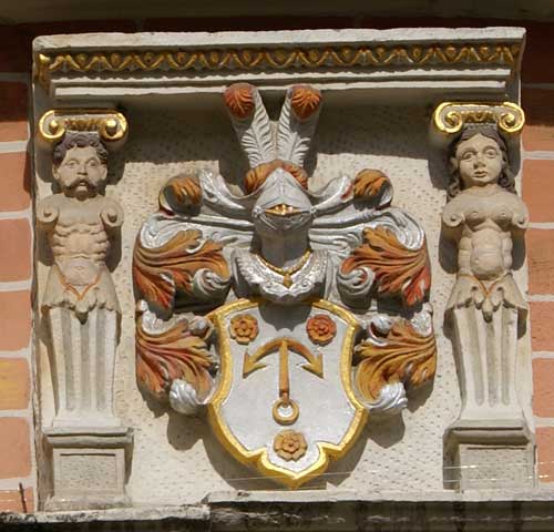 Wappen der Ehefrau, Elisabeth Gogreve, Tochter von Johann Gogreve und Metta Deseniß: In Silber ein gestürzter, roter Anker ohne Stock, aufrecht mit dem Ring nach unten gestellt, begleitet von 3 (2:1) roten Rosen. Helmzier zwei Straußenfedern, Helmdecken rot-silbern.