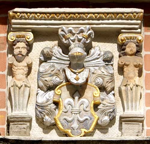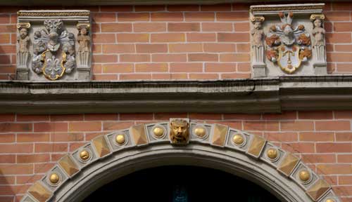 Hauptportal mit Löwenmaske und den beiden Wappen des Bauherren-Ehepaares Gerd Leist und Elisabeth Gogreve darüber.