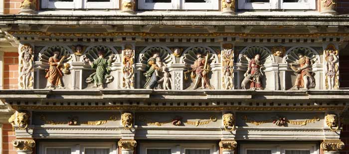 Schmuckzone der Auslucht zwischen den beiden Stockwerken der Auslucht mit Darstellung der christlichen Kardinal-Tugenden: Glaube, Hoffnung, Liebe, Gerechtigkeit, Geduld und Klugheit.