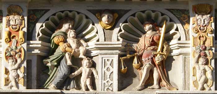 Detail mit Darstellungen von zwei der Tugenden (Liebe links und Gerechtigkeit rechts) auf dem Brüstungsfries der Auslucht.